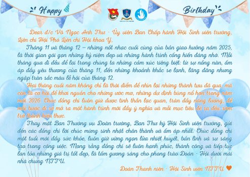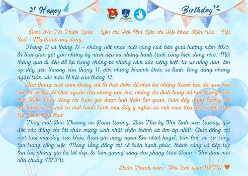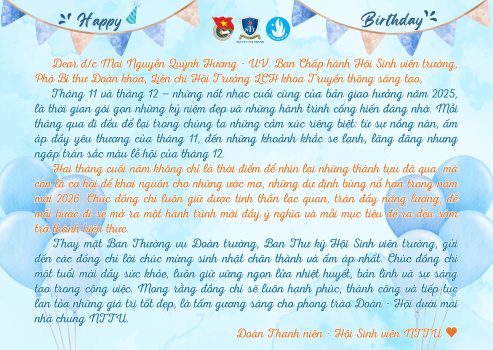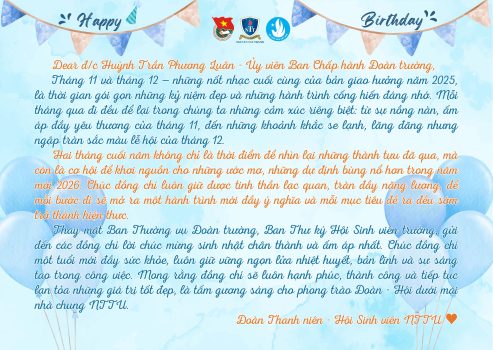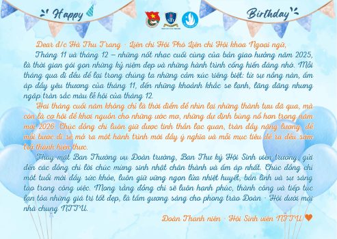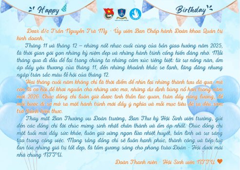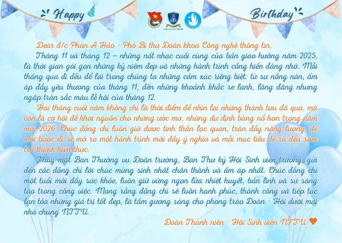 Thay mặt Ban Thường vụ Đoàn trường, Ban Thư ký Hội Sinh viên trường, gửi đến đồng chí những lời chúc mừng sinh nhật thật chân thành và ấm áp. Chúc đồng chí một tuổi mới đầy sức khỏe, luôn giữ vững sự nhiệt huyết, bản lĩnh và sáng tạo trong công việc. Mong rằng đồng chí sẽ luôn hạnh phúc, thành công và tiếp tục truyền cảm hứng, lan tỏa những giá trị tốt đẹp trong phong trào Đoàn – Hội, đồng thời tiếp tục là tấm gương sáng dưới mái nhà chung NTTU.