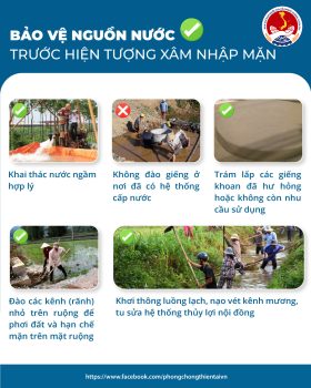 Nâng cao ý thức cộng đồng và sử dụng tiết kiệm tài nguyên nước: Mỗi người dân cần nâng cao ý thức sử dụng nước ngọt một cách tiết kiệm, hiệu quả trong sinh hoạt hàng ngày. Kiểm tra, sửa chữa kịp thời các đường ống, thiết bị chứa nước bị rò rỉ. Tích cực tham gia vào các hoạt động của cộng đồng nhằm bảo vệ nguồn nước, giữ gìn vệ sinh môi trường và tuân thủ các hướng dẫn, khuyến cáo của chính quyền địa phương và ngành nông nghiệp.