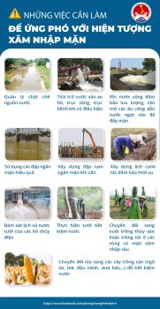 Thích ứng trong sản xuất nông nghiệp và nuôi trồng thủy sản: Người dân cần thường xuyên theo dõi chặt chẽ các bản tin dự báo thời tiết, tình hình xâm nhập mặn của các cơ quan chuyên môn để có kế hoạch sản xuất phù hợp. Chủ động trữ nước ngọt bằng nhiều hình thức như trong ao, hồ, các dụng cụ chứa nước lớn trong gia đình khi nguồn nước còn đảm bảo chất lượng. Áp dụng các biện pháp tưới tiêu tiên tiến, tiết kiệm nước như tưới nhỏ giọt, tưới phun sương, tưới luân phiên. Quan trọng hơn cả là việc chuyển đổi cơ cấu cây trồng, vật nuôi cho phù hợp với điều kiện thực tế. Ưu tiên lựa chọn các giống cây trồng, vật nuôi có khả năng chịu mặn tốt, có giá trị kinh tế cao. Nhiều mô hình canh tác thông minh thích ứng với hạn mặn như lúa – tôm, chuyên canh các loại cây ăn trái chịu mặn, hoặc phát triển các mô hình nuôi trồng thủy sản nước lợ, mặn đã và đang mang lại hiệu quả.