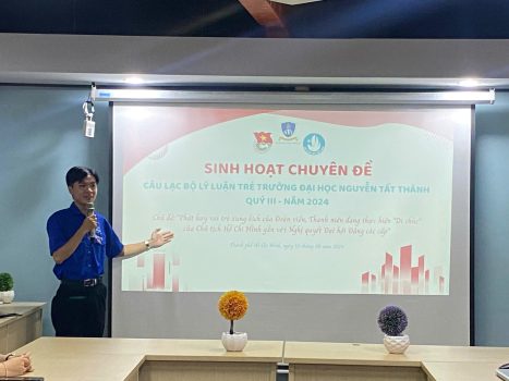 Sáng ngày 10/08/2024, tại Trường Đại học Nguyễn Tất Thành, Câu lạc bộ Lý luận trẻ trực thuộc Đoàn Thanh niên – Hội Sinh viên Nhà trường đã tổ chức thành công buổi sinh hoạt chuyên đề quý III – năm 2024 với chủ đề: “Phát huy vai trò xung kích của Đoàn viên, Thanh niên đang thực hiện ‘Di chúc’ của Chủ tịch Hồ Chí Minh gắn với Nghị quyết Đại hội Đảng các cấp”.