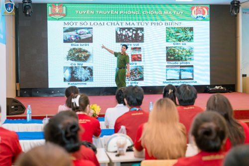 Chuyên đề có sự tham gia chia sẻ của Đại uý Vũ Đình Thinh, cán bộ Đội 1 – Phòng Cảnh sát điều tra tội phạm về ma tuý – Công an TP. Hồ Chí Minh. Với kiến thức chuyên môn sâu sắc và kinh nghiệm thực tiễn phong phú, Đại uý đã mang đến cho sinh viên cái nhìn cụ thể, rõ ràng và cảnh tỉnh về các nguy cơ cũng như hậu quả nghiêm trọng của việc sử dụng ma tuý, đặc biệt là trong môi trường học đường.
