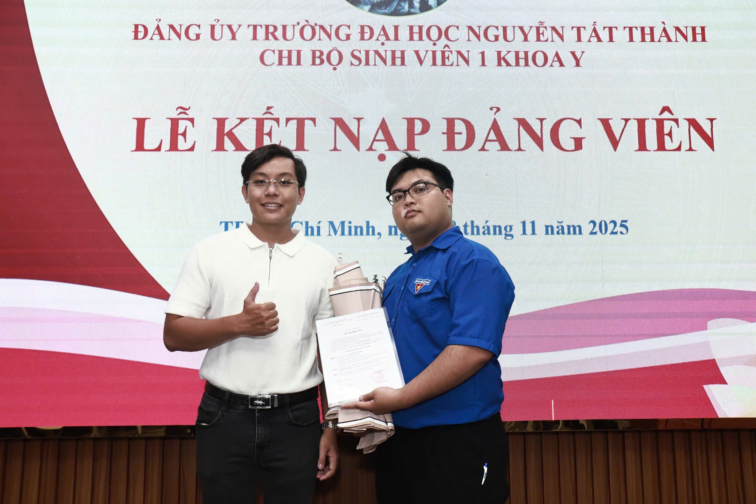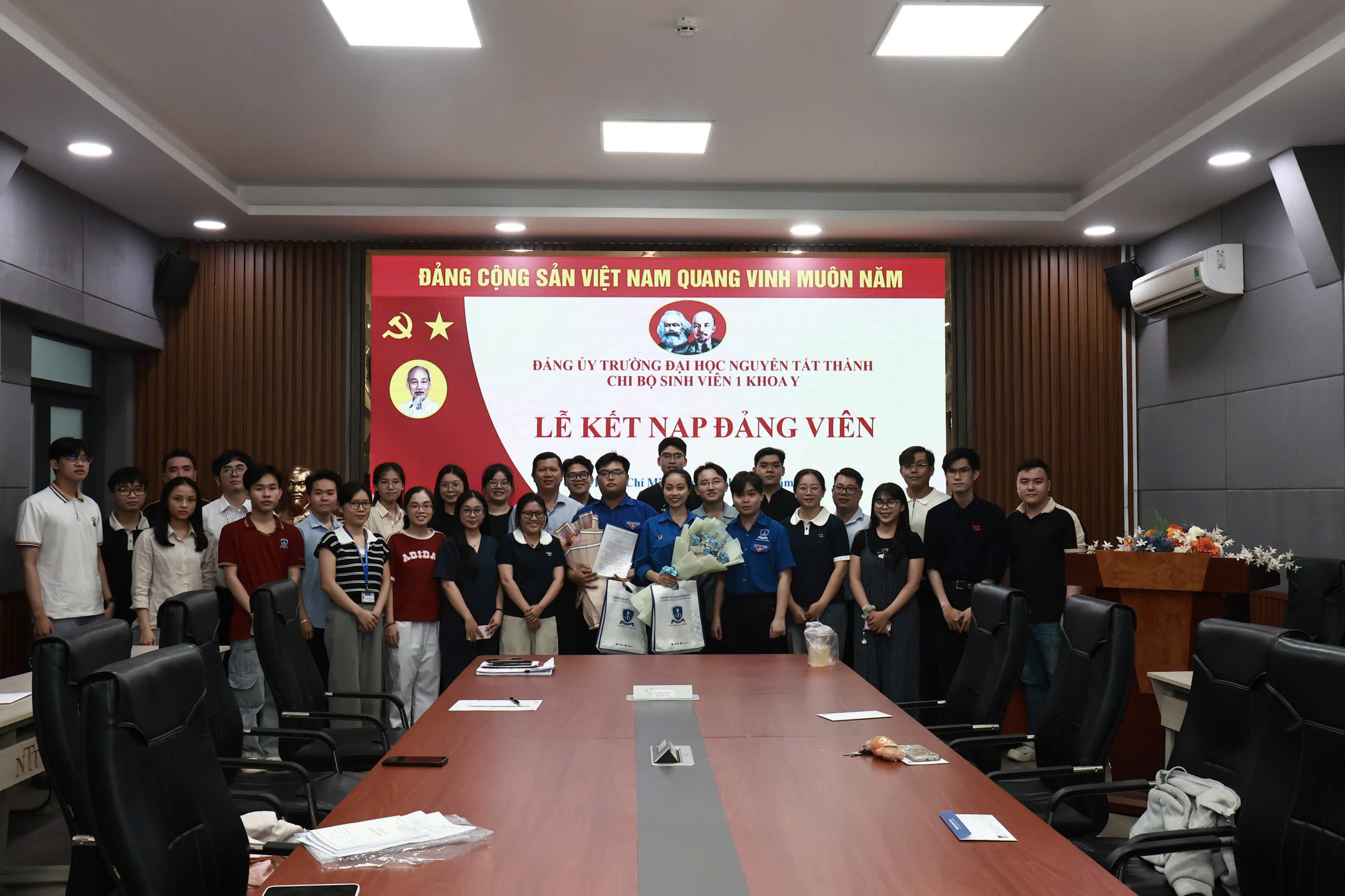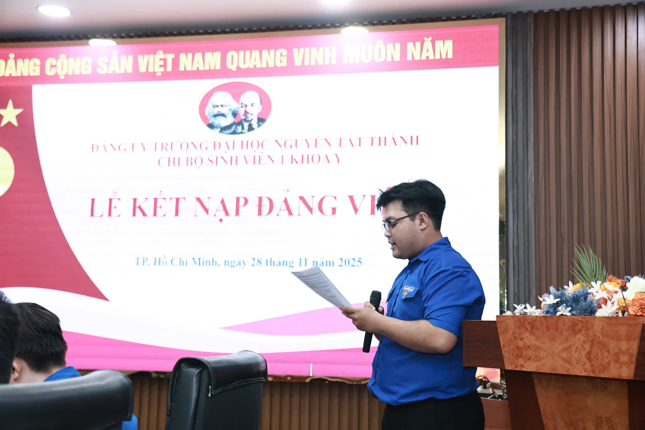 Trong không khí trang nghiêm và đầy tự hào, ngày 28/11/2025, tại Trường Đại học Nguyễn Tất Thành, Chi bộ Sinh viên 1 – Khoa Y đã long trọng tổ chức Lễ kết nạp Đảng viên mới cho quần chúng ưu tú – cán bộ Đoàn tiêu biểu của Khoa Y: