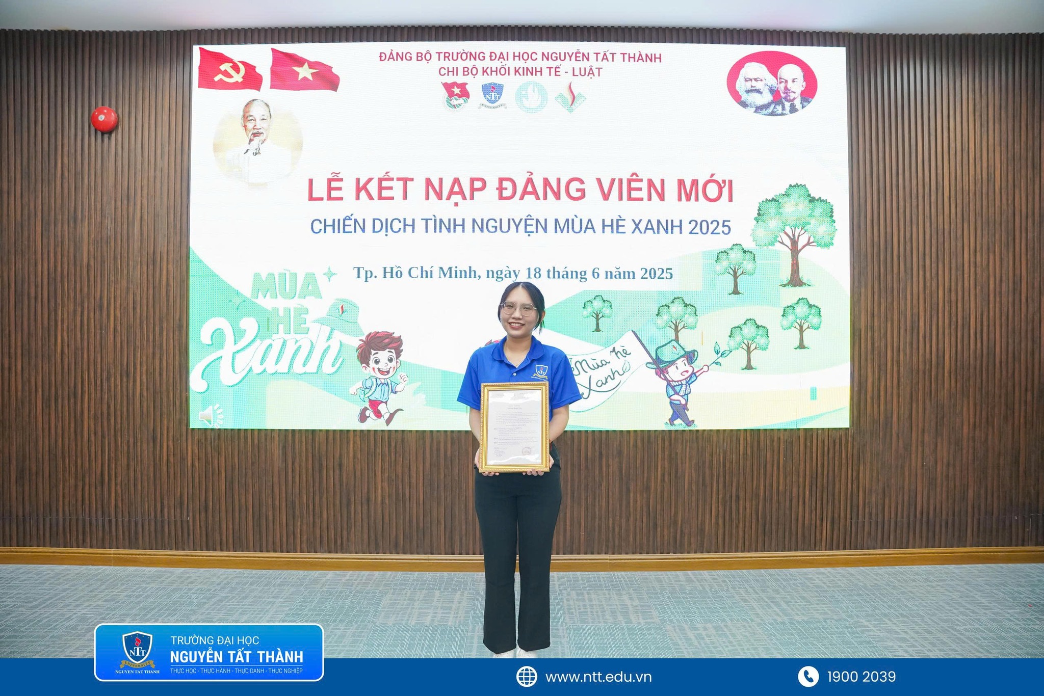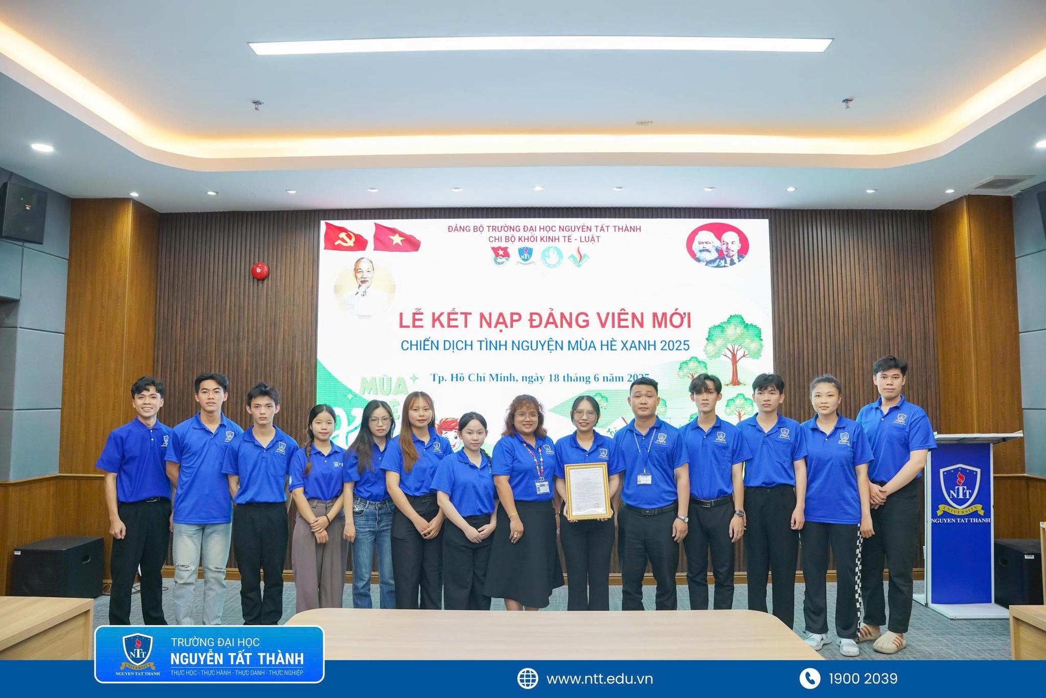 Trong không khí hân hoan của tuổi trẻ NTTU thi đua lập thành tích chào mừng kỷ niệm 26 năm ngày thành lập trường ĐH Nguyễn Tất Thành (05/06/1999 – 05/06/2025) và kỷ niệm 31 năm các chương trình, chiến dịch tình nguyện hè (1994 – 2025), sáng ngày 18/06/2025 được sự cho phép của Đảng ủy trường Đại học Nguyễn Tất Thành Chi bộ Khối Kinh tế – Luật đã trang trọng tổ chức Lễ kết nạp Đảng viên mới cho quần chúng Trần Thị Thanh Thúy – Bí thư Chi đoàn 22DLK1B và là chiến sĩ tham gia chiến dịch Mùa hè xanh năm 2025 trường Đại học Nguyễn Tất Thành.