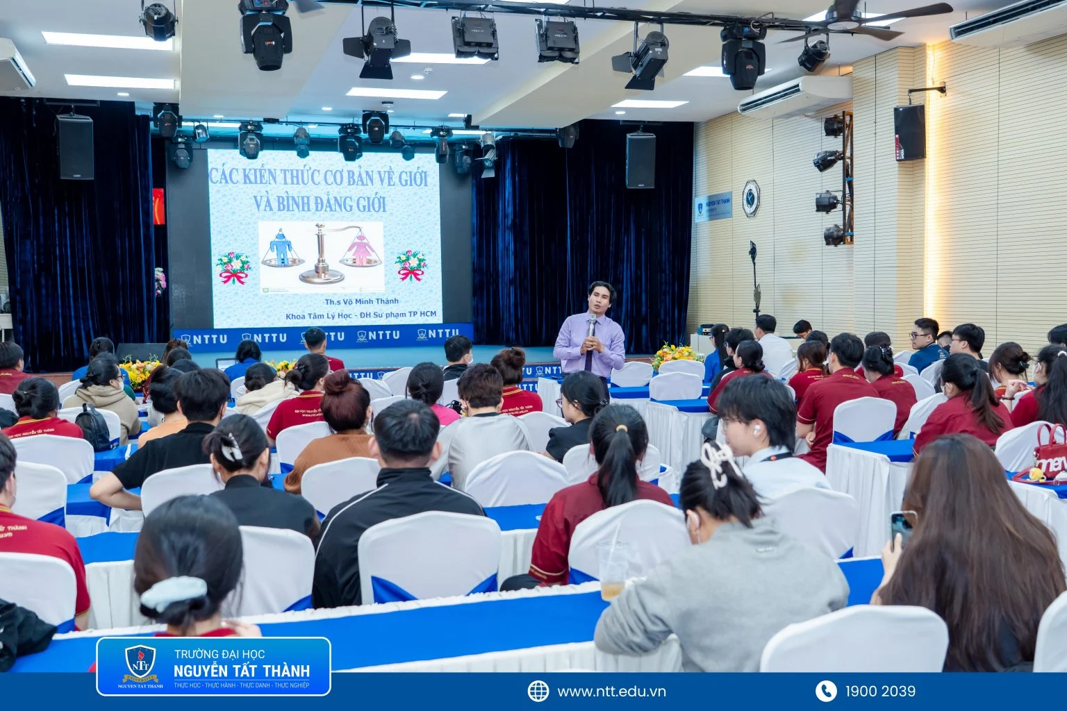 Ngày 25/12 vừa qua, Trường ĐH Nguyễn Tất Thành đã tổ chức hội thảo Nâng cao nhận thức về bình đẳng giới cho sinh viên năm 2025 với mục đích nhằm tạo ra không gian giáo dục giúp sinh viên cùng trao đổi, chia sẻ kinh nghiệm về sự bình đẳng giữa các giới trong môi trường học tập và xã hội. Hội thảo do ThS tâm lý Võ Minh Thành – Giảng viên khoa Tâm lý học Trường ĐH Sư phạm TP. HCM làm diễn giả.