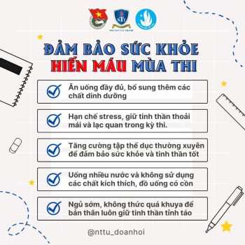Rất nhiều bạn NTTU-ers vẫn đang còn băn khoăn lo lắng chưa biết phải làm sao để đảm bảo sức khỏe khi tham gia hiến máu trong dịp thi căng thẳng sắp tới. Vậy thì hãy đọc ngay 1 số lưu ý dưới đây nhé.