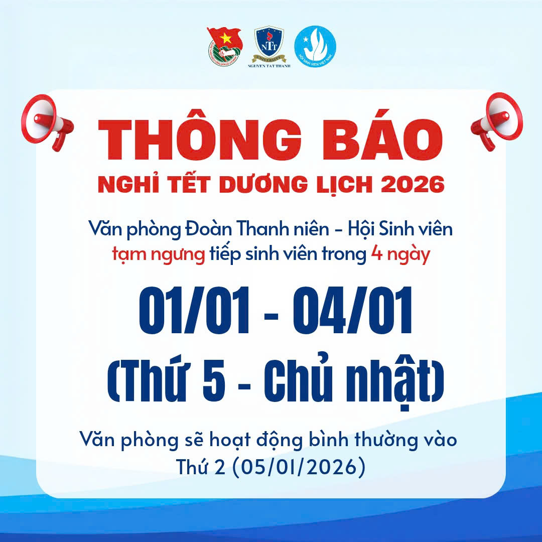 Nhân dịp Tết Dương lịch 2026, Văn phòng Đoàn Thanh niên – Hội Sinh viên xin trân trọng thông báo đến toàn thể sinh viên lịch nghỉ như sau: