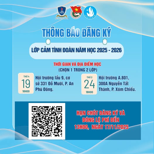 – Lớp 1: 18h00 ngày 19/11/2025 (Thứ 4) | Hội trường lầu 9, cơ sở 331 Đỗ Mười, P. An Phú Đông.